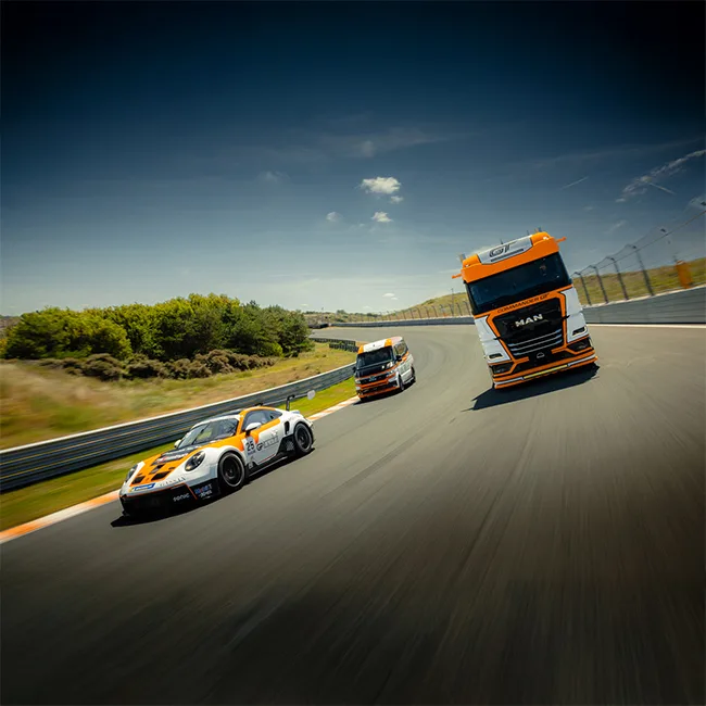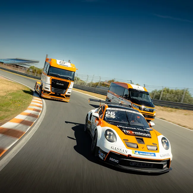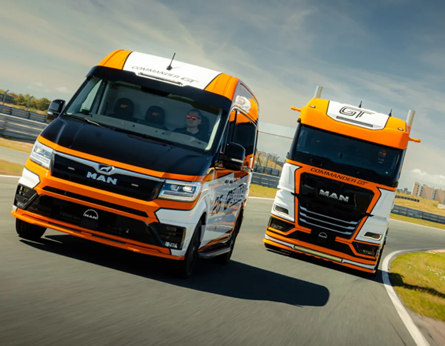 Net als voorgaande jaren is er ook dit keer een MAN TGE in Commander GT-stijl. De bus is uitgevoerd met lichtmetalen velgen, een MAN Individual achterspoiler en sidesteps. Daarnaast is de TGE voorzien van een zonneklep met geïntegreerde LED-lichtbar en een zwart-oranje lederen interieur. Tot slot is de laadruimte volledig ingericht met een ALUCA kastenwand, inclusief omvormer en koelkast, zodat hij perfect dienstdoet als mobiele werkplek in de autosport.