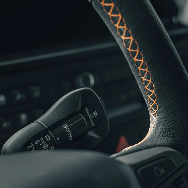 - Het interieur met zwarte lederen stoelen en stuurwiel in alcantara, afgewerkt met oranje accenten