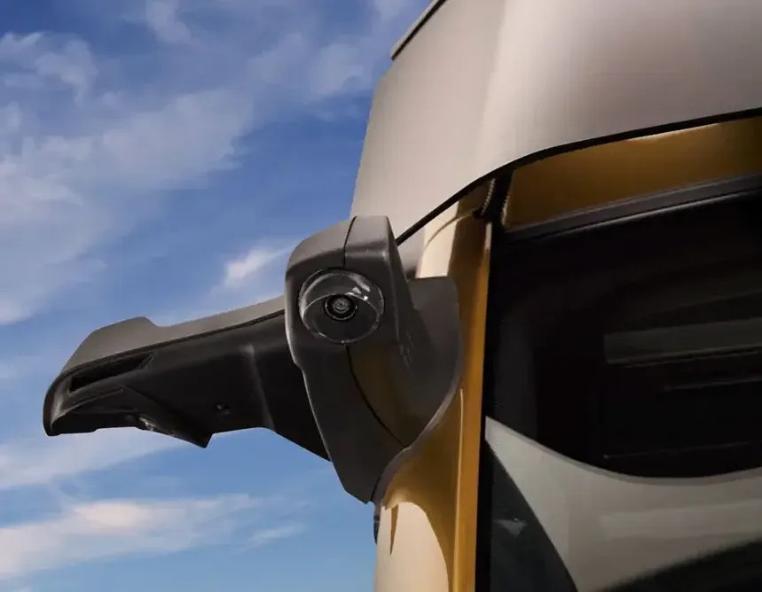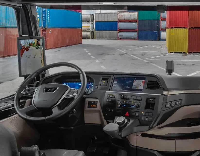 De twee schermen met hoge resolutie in de cabine passen zich automatisch aan de omgevingshelderheid aan, zodat het camerabeeld altijd duidelijk zichtbaar is.