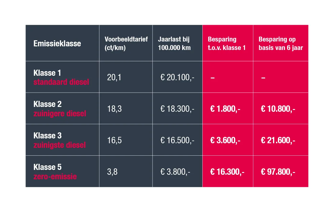 De VECTO-klasse en bijbehorende tarieven worden voor 6 jaar vastgesteld. Investeer je nu nog in een VECTO 3 truck, profiteer je 6 jaar van gunstige tarieven. Wacht je te lang, dan ga je meer heffing betalen voor dezelfde truck.